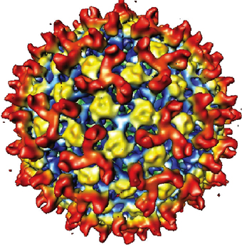 The non-glycosylated outer capsid proteins of BTV are involved in virus entry to the host cells. A combination of three-dimensional (3D) structural determination and molecular/ biochemical analysis of the BTV outer capsid has given some insight into how the two outer capsid proteins could function in cell entry/membrane penetration processes in an analogous manner to enveloped virus proteins. Cryo-electron microscopy (Cryo-EM) and image reconstruction of BTV particles have been used to deduce the general relationships of the two outer capsid proteins within the virus particle. An initial low-resolution (45 Å) 3D reconstruction followed by a higher resolution (22 Å) reconstruction of BTV particles revealed a well-ordered morphology of the virion particle with icosahedral symmetry and provided details of the essential organization of the two outer capsid proteins. An accurate position of the two proteins, VP2 and VP5, in relation to each other and to the underlying protein layer of the core was clearly defined .